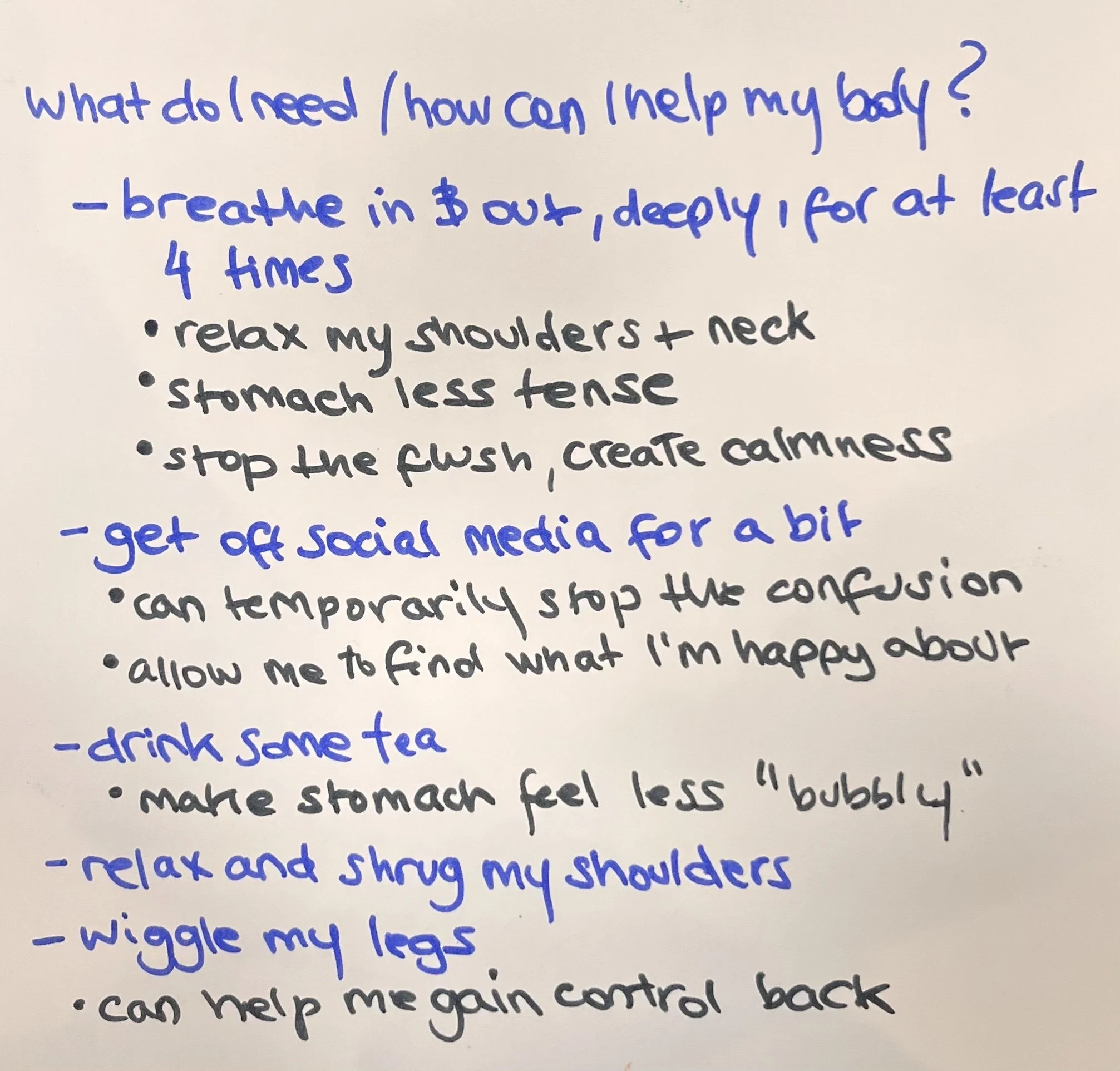 Take a moment to name what you expressed. Naming sensations or emotions can lessen their intensity and help restore a sense of agency. Finally, turn the page and reflect on what might help counterbalance any discomfort you discovered. You are the expert of your own body. Trust its signals. Protect your peace. Caring for yourself is often the first step toward caring for others.